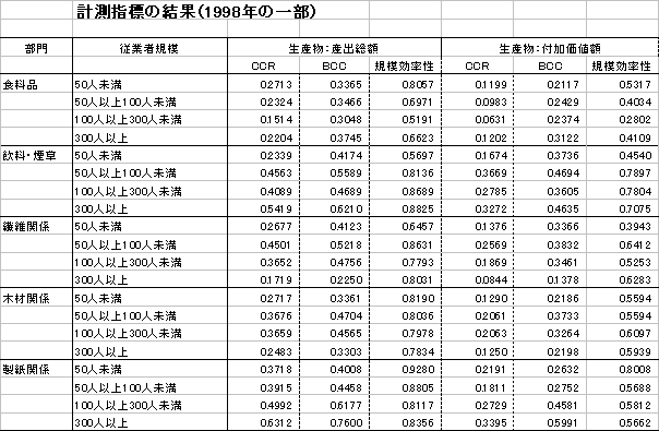 しかし、一次金属製品部門の効率性が高く、食料品部門の効率性が低いという傾向は、いずれの生産物の定義においても共通している。また、1997年から1998年にかけては、ほとんどの計測指標において効率性が低下しており、アジア経済危機の影響が推察される。計測結果の一部(1998年データの特定部門のみ)については、以下の表に示されている。